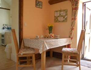 The cosy sitting room includes comfortable seating and a TV, perfect for relaxing after a day of exploring. Adjacent to the sitting room is the fully equipped galley kitchen, which includes modern appliances and all the essentials for preparing meals. The dining table offers a charming space for intimate meals.